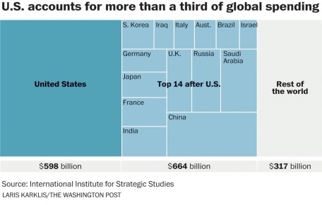 How does Chinese military spending compare to the U.S.? Again whilst Chinese military spending has increased in recent years, it is still approximately only a third of the $700 billion U.S. military budget for 2018. The graph to the left based on 2016 figures gives an indication of how massive the U.S. budget is compared to rest of the world.
