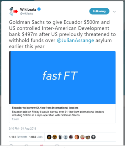 As Wikileaks tweeted on August 31st, there has been direct economic pressure placed on Ecuador to hand over Assange in the form of one billion dollars from Goldman Sachs and the Inter-American Development Bank. Jimmy Dore and Abby Martin discuss what the Trump Presidency is doing to pressure Ecuador on the Dore show here.