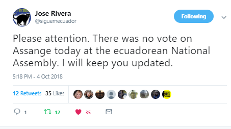 The plenary session of the National Assembly to debate Assange’s citizenship occurred on Thursday 4th October. Due to the complete blackout in the Western press, we were only able to obtain information in English about the vote from a Twitter account from an Assange supporter in Ecuador called Jose Rivera. He tweeted that the U.S. aligned parties had failed in their efforts to review Assange’s citizenship (a step towards revoking it) as they narrowly lacked the numbers necessary. As a consequence, the vote to review Assange’s citizenship status did not occur.