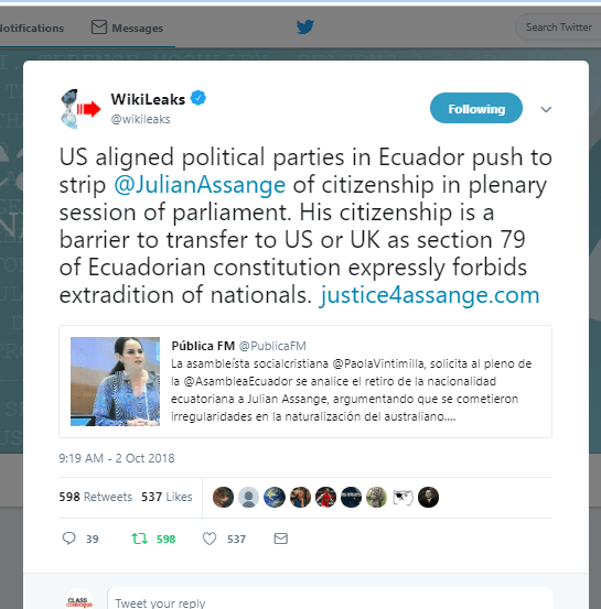 There are moves afoot which show that the high-level conspiracy to hand Julian Assange over to U.S. authorities to be prosecuted for Espionage continues apace. On Oct 2nd, the Wikileaks Twitter account announced that U.S. aligned parties in the Ecuador National Assembly were planning to vote on taking steps towards stripping Assange of his Ecuadorean citizenship, which has acted as a legal barrier to his extradition to the U.S. There was a complete media blackout of this development in the English-speaking press. Not a single reference to the vote showed up in a Google news search.