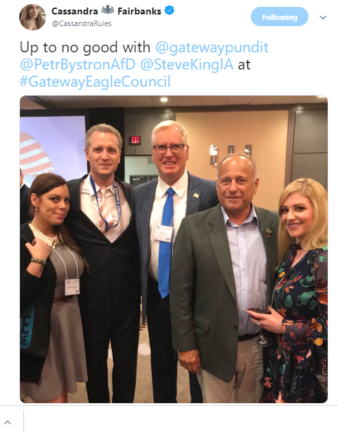 Cassandra Fairbank’s employer has also been busy promoting fascism internationally. In September, The Gateway Pundit co-hosted The Gateway Pundit’s Gateway Eagle Council XLVII with the arch-conservative lobby group the Eagle Forum. Aptly described by the Nation Magazine as “Davos for Fascists”, the forum brought together far-right media, military, religious and political figures from the US. Cassandra Fairbanks herself, appeared on behalf of The Gateway Pundit on a panel called “Women Warriors”.