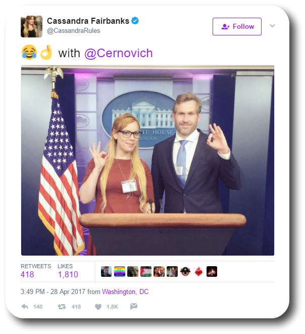 Fairbanks has been politically and personally linked to high-profile, white supremacist/alt-right figures. She unsuccessfully tried using the courts to suppress a photo of herself giving a white nationalist symbol in the White House Press Room alongside notorious alt-right figure, Mike Cernovich. Fairbanks has also endorsed the German fascist party the ‘Alternative für Deutschland’.