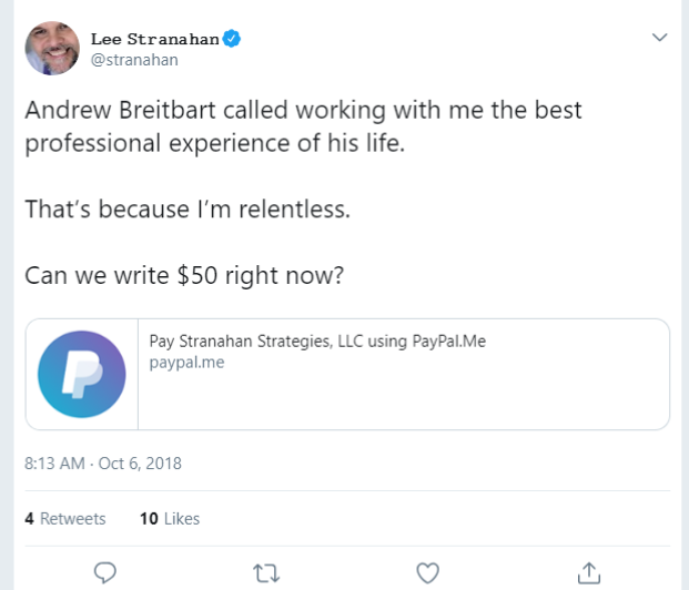 Although Stranahan might downplay his Breitbart News connections whilst appearing on #Unity4J online vigils, he is far from ashamed of his association. As recently as October 6th, in order to solicit donations from his far-right supporters, Stranahan tweeted that Andrew Breitbart had said working with him was the “best professional experience of his life”. As for his other employer at Breitbart News, Stranahan declared, “I love Bannon”.