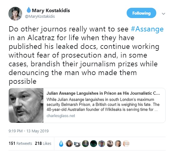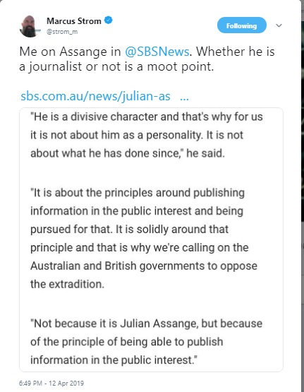 Whilst Marcus Strom might think this is a pragmatic way of dealing with the opposition of some elements within the MEAA to Julian Assange in effect it is a cowardly adaption to that part of the journalism profession that has surrendered their principles and enthusiastically joined the persecution of Assange.