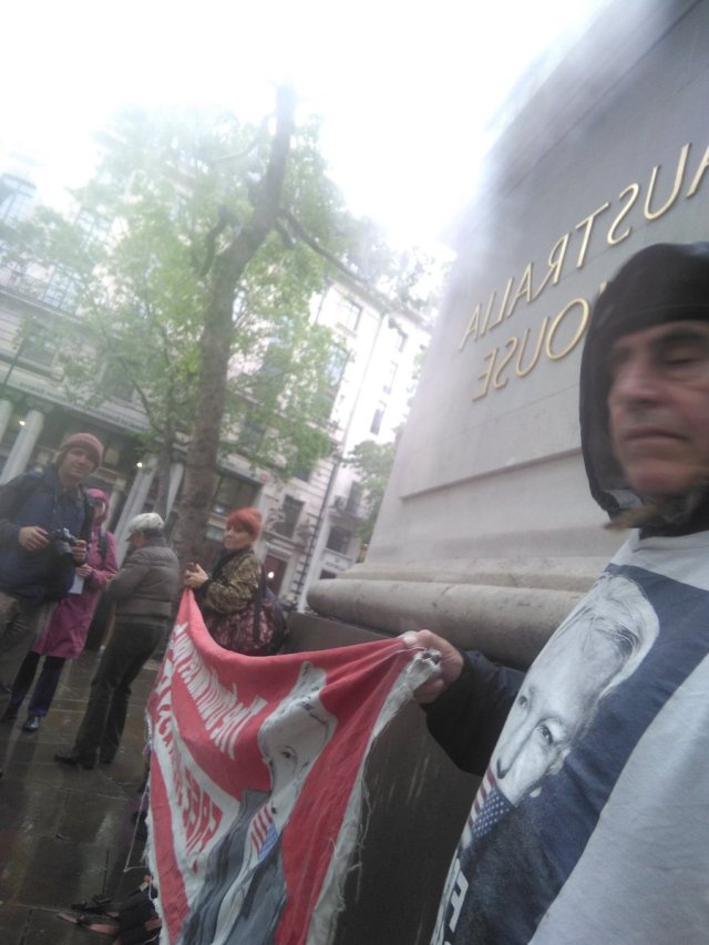 Despite these acts the protest continued and about 20 protesters rallied. A speech by Joanna Mogilevska of classconscious.org can be seen here. The movable billboard demanding Julian Assange be “brought home” also paid the protest a visit.