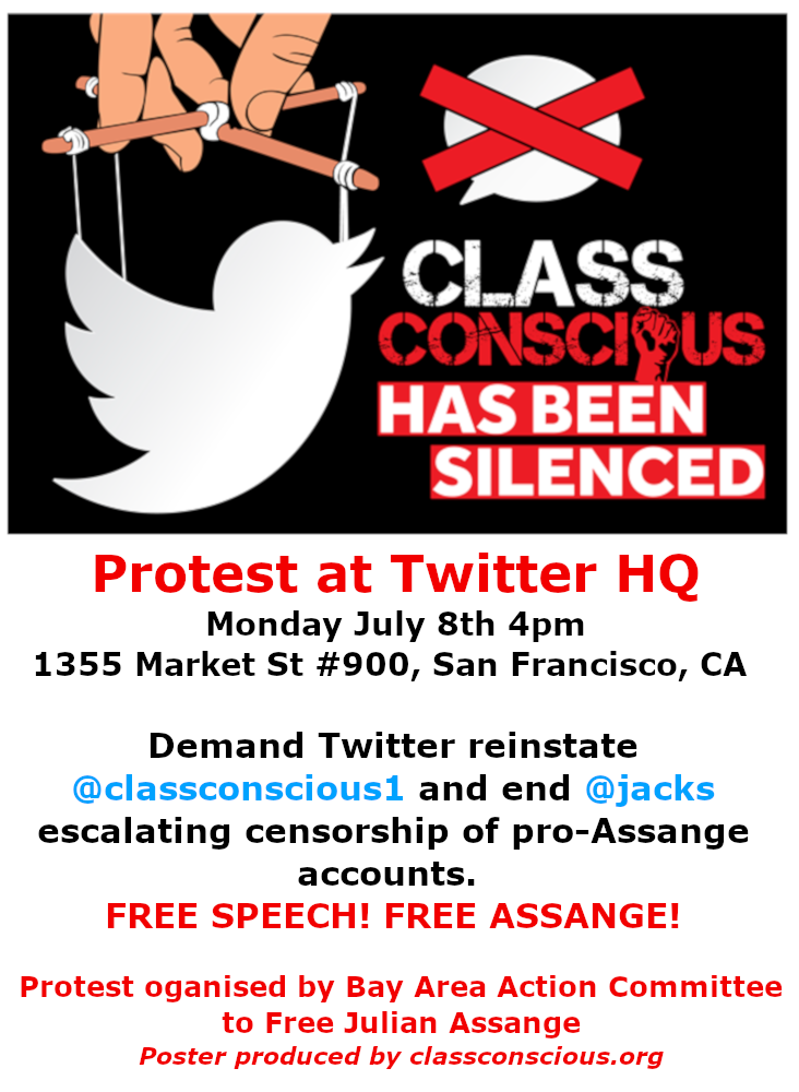 On June 18th, the Twitter account of classconscious.org (@classconscious1) was suspended without warning or justification. We immediately launched a political counter attack against this outrage, linking our censorship to the censoring of other pro-Assange accounts. After three weeks, on July 9th, our account was restored. Important political lessons can be drawn about the power of solidarity in overcoming attacks on free speech by the capitalist tech oligarchs. The fight for Assange and Manning’s freedom cannot be won outside of the broader struggle against the drive to dictatorship, fascism and world war.