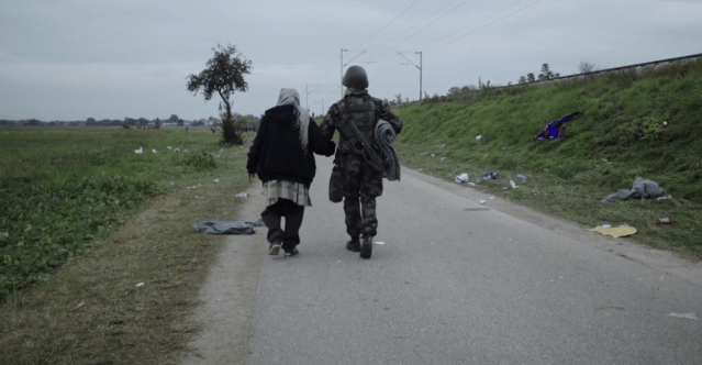 At the Austrian border we have a heavily armed soldier holding an elderly woman’s hand to assist her down the road, while the head of police communications narrates: “I have a deep respect for all the police offices doing this job because its not easy.. ..we show a lot of fire, a lot of strength.. but inside of that armour is a person”.