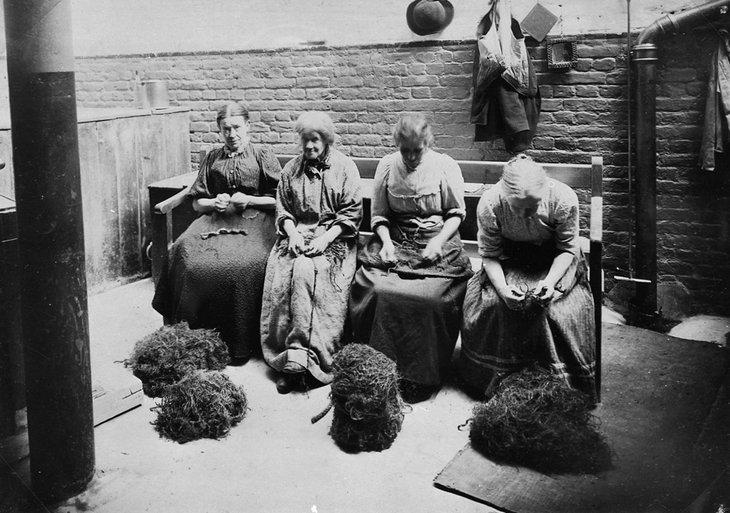 One such was ‘picking oakum’ or ‘picking junk.’ The punishment arose in the British Navy, and it was also the work of the poor in seaside villages. Oakum consists of the broken-up fiber of old hemp ropes mixed with tar. ‘Picking oakum’ involved beating these old ropes with a wooden mallet, and then unravelling the twisted rope fibers, embedded in tar, with the bare fingers, and then with the fingernails. It was tedious, dirty work which resulted in bloody fingers, tendonitis, bursitis and repetitive strain injuries. The toll on mental health was also immense. The oakum was used as waterproofing in wooden ships, and as the world’s first naval and seaborne commercial empire, Britain needed a lot of waterproofing. Prison labour provided much of this material.