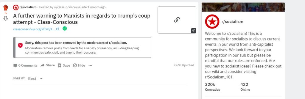 On November 26th, classconscious.org posted on the Socialism subreddit an article entitled “A further warning to Marxists in regards to Trump’s coup attempt”. A short time later the account was permanently banned by the moderators for breaking their policy on promoting “lesser evilism”. The r/socialism sub-reddit has over 320,000 members and is one of the largest forums on the internet where socialists can share information. Reddit itself is the 17th most visited site on the internet. Whilst warning of the threat of a fascist coup by Trump – a warning which has been utterly vindicated – in no way did the article promote illusions in the Democrats or call for electoral support for them in any form. The article labelled both parties as utterly reactionary, however, it also discussed the different class forces the Republicans and Democrats rest upon and the different factions of the ruling class forces they represent. To construe all such analysis as “lesser evilism” is simplistic and ridiculous!