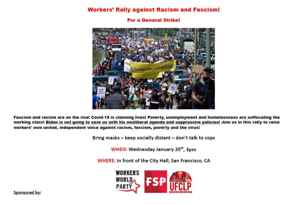 Although this United Front call did not gain wide traction, seeds of the strategy could be seen in the support by Vermont AFL-CIO for a general strike, actively promoted by its President David Van Deusen. Similarly, a rally occurred in the Bay Area on the 20th of January where a variety of left groups gathered under the banner of a “For a United Front against fascism and racism! General Strike now!”. At the rally links were made to other struggles of the working class, including the right to safe work during the pandemic, and immigrant, and prisoner rights. This is the entirely correct way for united front work against fascism to be built on in the future in the US.