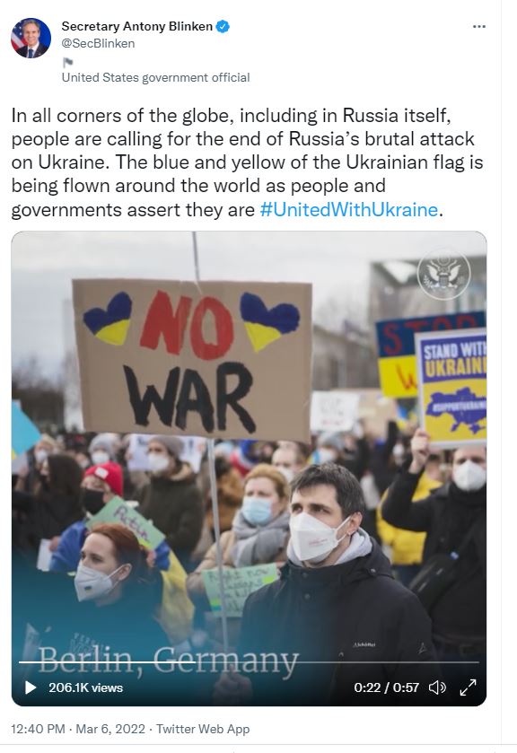 The obliteration of all of this context under an avalanche of war propaganda, justified by the suffering of civilians within Ukraine is giving a free hand to the US to posture as the defender of peace! What other explanation could there be for the obscenity of Secretary of State Anthony Blinken, who stands upon the mountain of corpses that lies under US Imperialism, being able to tweet out footage curated by the State Department of people holding “No War” signs at rallies from around the world.