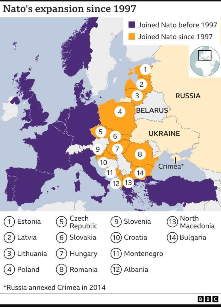 The most important “reality” being obscured is that Russia has launched its war on Ukraine in the context of its encirclement by US imperialism. After the collapse of the USSR and the restoration of capitalism in Russia, the new capitalist ruling class hoped to be able to exploit the Russian working class on its own and to be left in peace by US imperialism to grow rich. They were given assurances that NATO would not move “one inch east”. However, imperialist appetites know no bounds. Why should the new and relatively weak capitalist rulers of Russia be the ones to benefit from the sea of natural resources of the Russian landmass? Nor was it acceptable that the Russian ruling class inherited a massive nuclear arsenal and powerful military in which to guard these natural resources and act independently. So, since 1997 NATO expanded its membership ever eastward. Now over half of its member states are former Soviet Republics and Russia is nearly encircled from its Eastern flank from Estonia in the North to Turkey in the South. Is it any wonder that Ukraine’s desire to add its 2295 kilometre border with Russia to the NATO camp is seen as deeply threatening? How could Russia not see the potential placement of nuclear weapons in Ukraine, so close to Moscow, as anything other than preparation for a pre-emptive nuclear strike capacity?