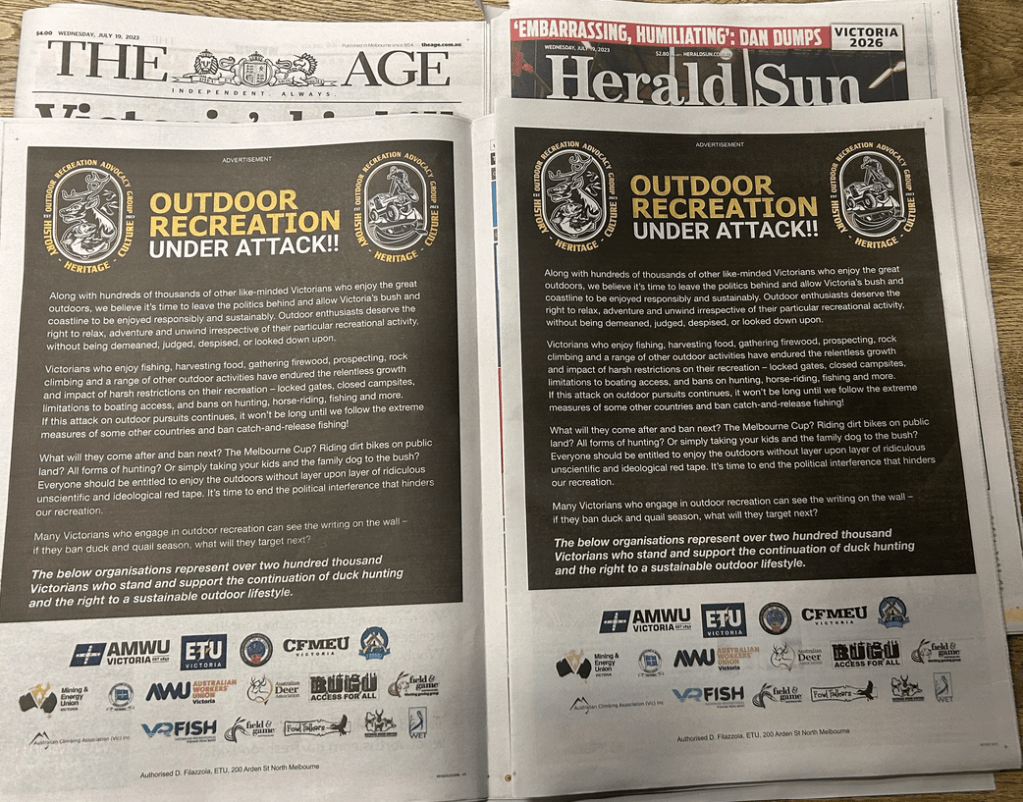 On July 19th, the same unions paid for full page ads in the Herald Sun and The Age under the blaring headline “Outdoor Recreation Under Attack”. The ad whipped up fears of what was at stake…