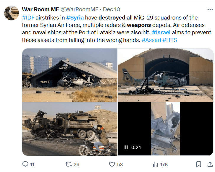 Israel has effectively removed a potential entire front in the ongoing war against the resistance. Iran has already demonstrated its capacity to hit Israel powerfully and directly but it has temporarily lost the ability to threaten Israel on its borders via its allies. Whilst Assad was not actively opening up the Golan Heights front in the last 14 months, the complete destruction of the Syrian Army, navy and air-force removes this potential for the for-seeable future.