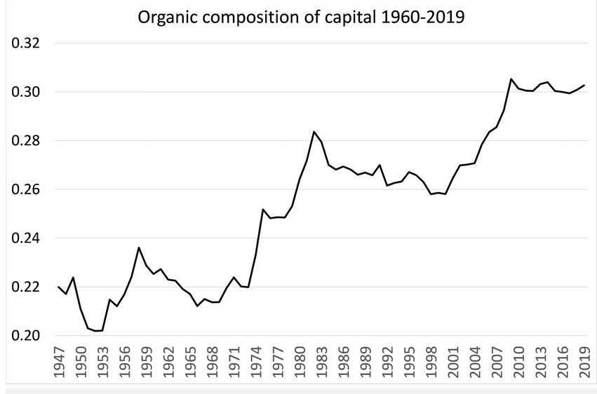 At the same time as profitability sinks, the organic composition of capital is rising, accelerated by AI-driven automation. Ever fewer workers are needed to operate ever larger, more complex means of production. Capital must extract more surplus from a shrinking base of labor power, which exerts more pressure on profit rates.