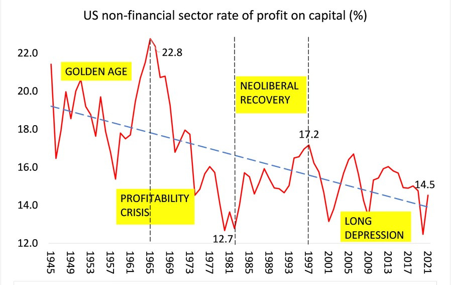 The rate of profit has not truly recovered to pre-recession levels. Corporate profits are rising in absolute terms, but the rate of return is too weak to generate sustained investment in real production. Roughly sixty percent of all corporate profits now flow straight into financial markets, feeding speculation rather than industry. Fictitious capital is driving capital accumulation, siphoning resources from production, and suppressing new investment more aggressively than at any point in the past half-century.